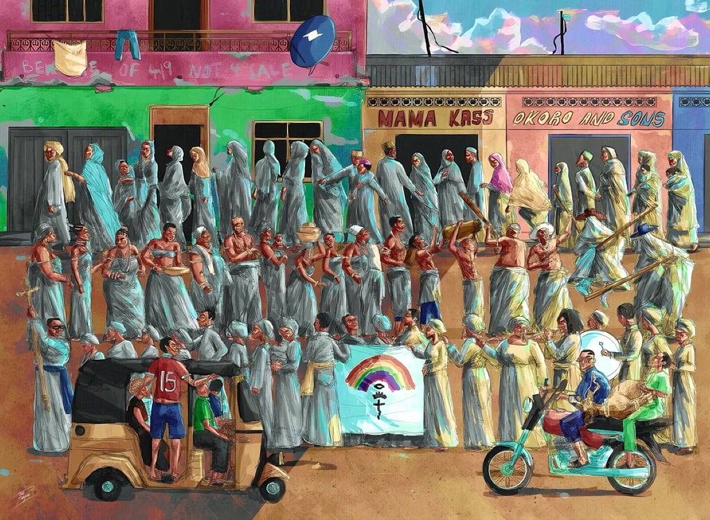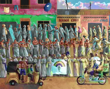 The artwork showed people from different faiths sharing the same space. Christians. Muslims. Traditional worshippers. No hierarchy. No separation. Just presence. Bodies next to bodies. Humanity uninterrupted.